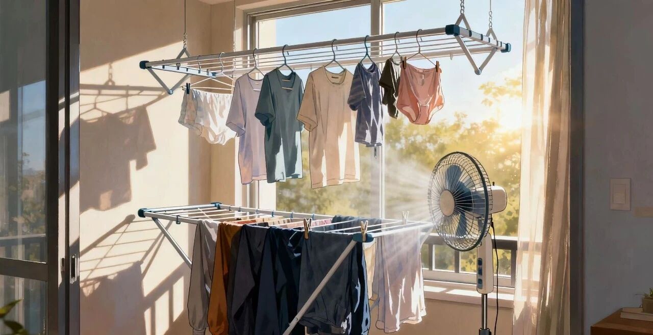 二是借助家里的电器“助攻”:空调调至“除湿模式”,持续运行能降低室内湿度;风扇对着衣物直吹,加速表面空气流动,帮助水分快速蒸发。对于毛衣、针织衫等容易变形的衣物,可先用毛巾按压吸干水分,再平铺在通风处,避免悬挂拉伸,同时在旁边放一杯热水,水蒸气能让衣物更快变干。